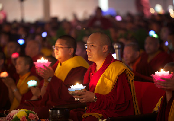法王先逐句帶領念誦藏英中三種語言的〈點燈祈願文〉,接著依傳統,由法王點燃第一盞燈,再傳燈下去,很快的,全場亮起各式各樣的燈,有點著燭火的彩色琉璃燈,有裝電池的祈願燭,還有傳統的印度土缽小燭火,點點如地上的星星般亮起。